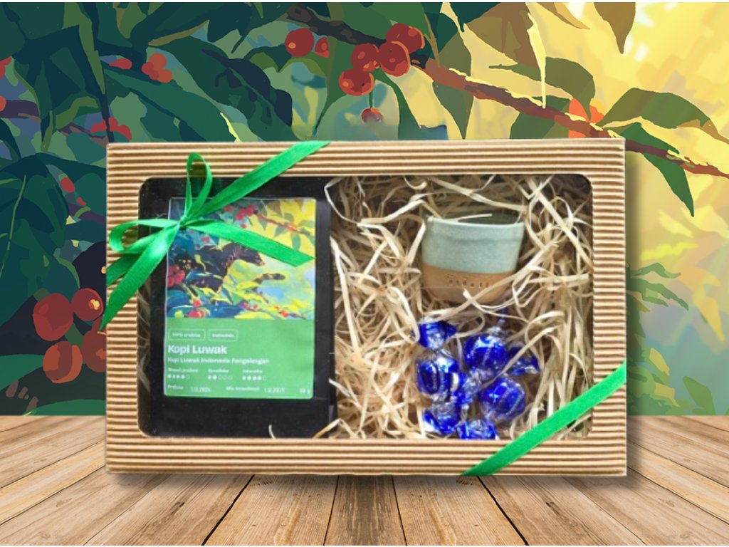 Luxusní dárková sada s cibetkovou kávou Kopi Luwak a originální ručně vyrobený keramický šálek Štěstí na espresso a k vynikající kávě zde najdete italské pralinky.