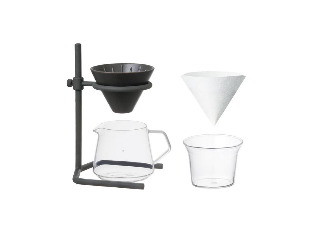 Kinto SCS‑S04 Brewer Stand Set (2 šálky) – stylová skupina pro filtrovanou kávu se stojanem, porcelánovým dripperem, skleněným serverem, držákem a filtrami.